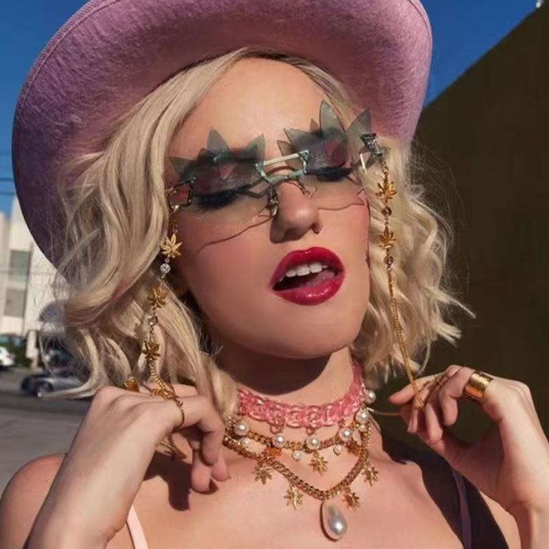 新款枫叶造型炫彩无框切边太阳眼镜舞会搞怪跨境外贸墨镜批发