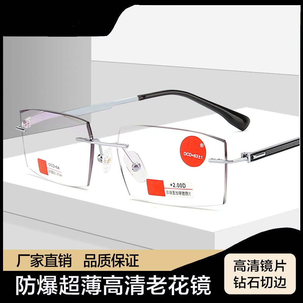 新款无框钻石切边金属老花镜男防蓝光时尚舒适老人镜8809眼镜