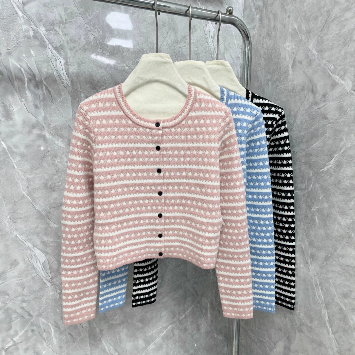 2025新款时尚百搭波浪花纹撞色条纹提花圆领单排扣长袖针织开衫女