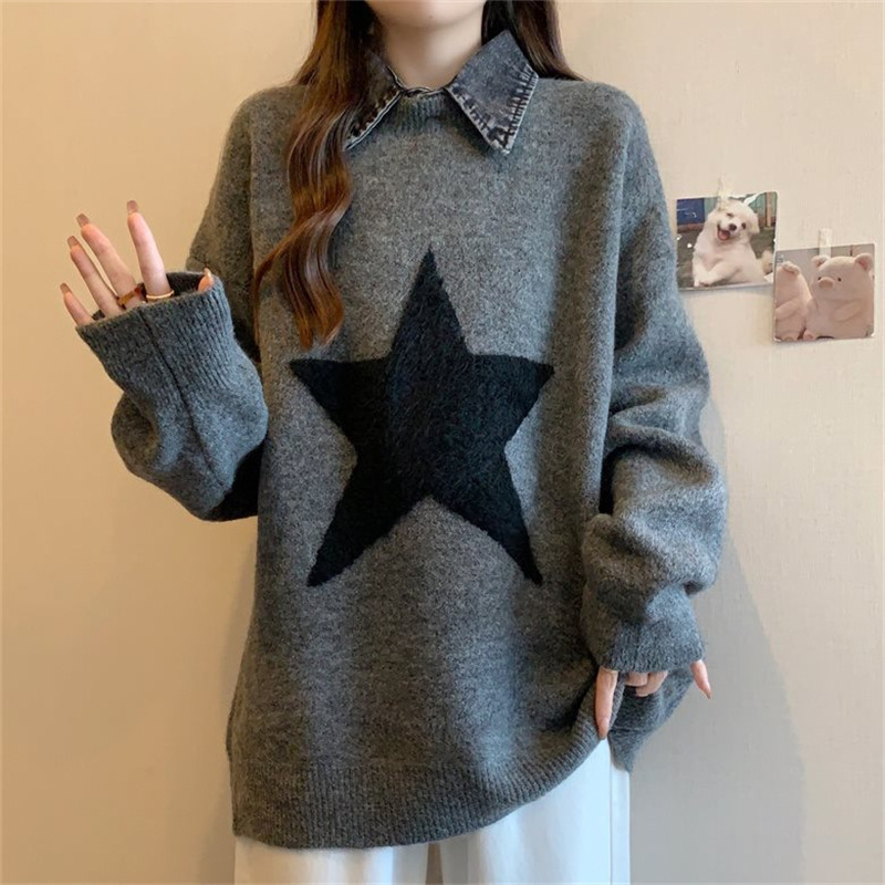 撞色星星提花2025新款时尚百搭宽松休闲百搭减龄打底针织衫上衣