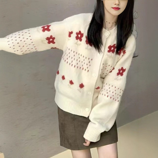 2025新款时尚百搭韩系氛围感提花百搭甜美圆领针织开衫毛衣外套