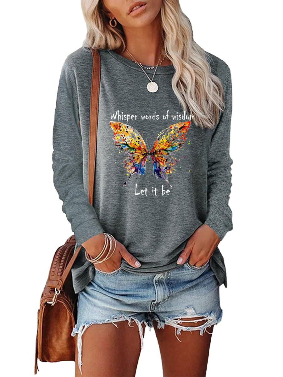 欧美秋季跨境圆领T恤蝴蝶系列3D印花女士七分袖休闲T恤上衣长袖