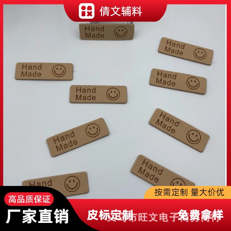 厂家直销HandMade笑脸超纤标皮标压印LOGO服装皮标牛仔裤商标皮牌
