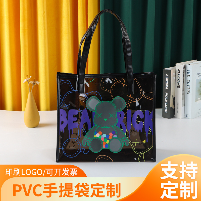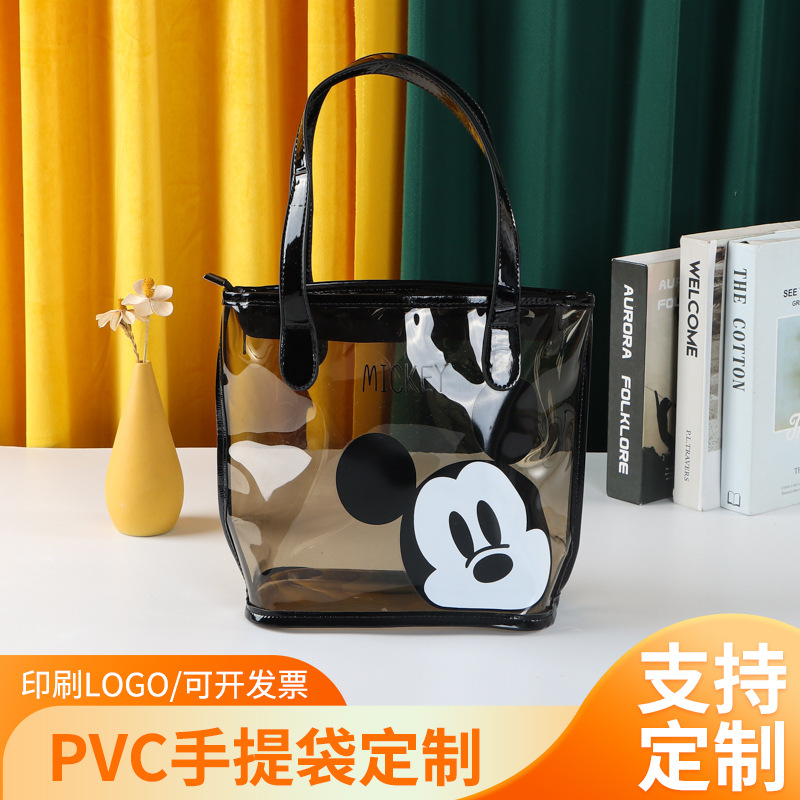 PVC黑色卡通半透明手提袋可定 制logo图案广告出差购物旅行收纳包
