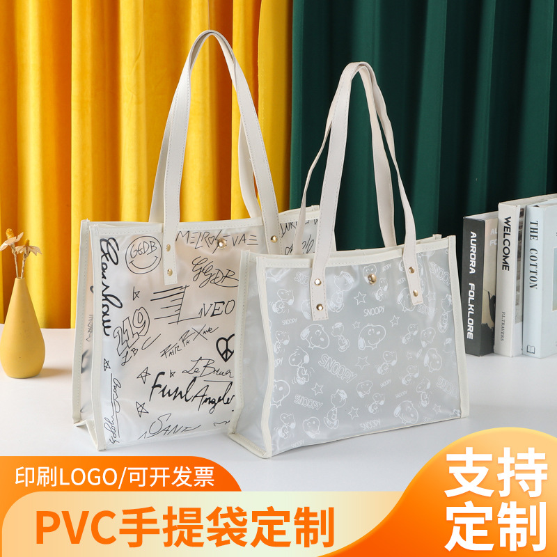 PVC磨砂手提袋定 制图案logo广告购物涂鸦卡通单肩透明旅行收纳包