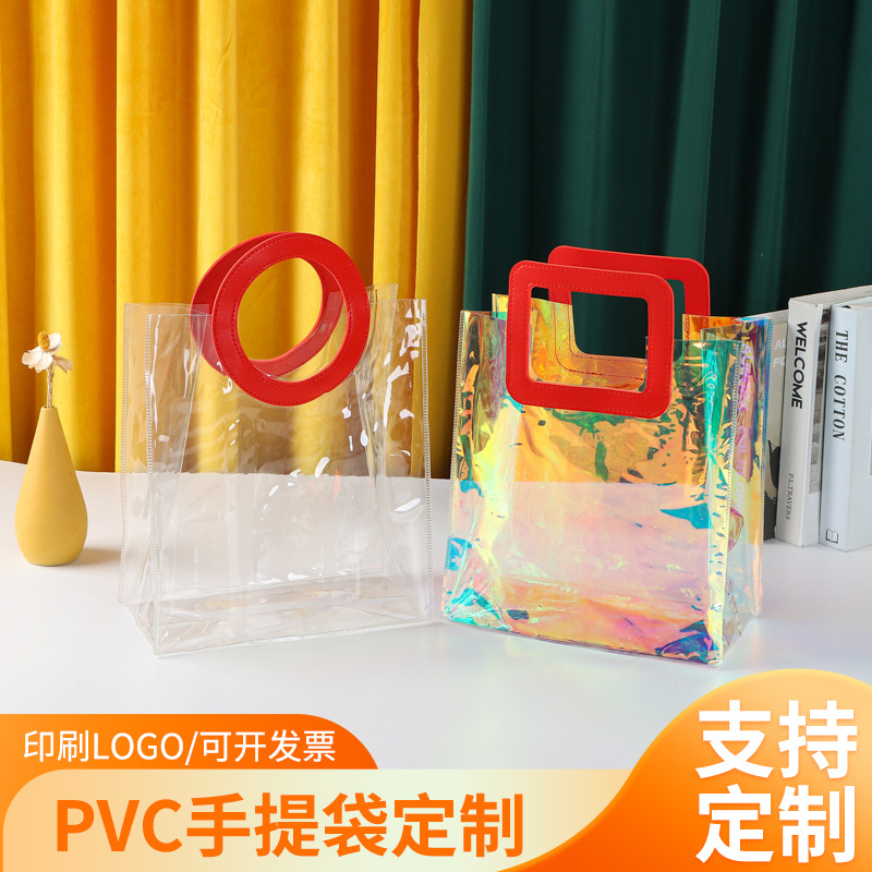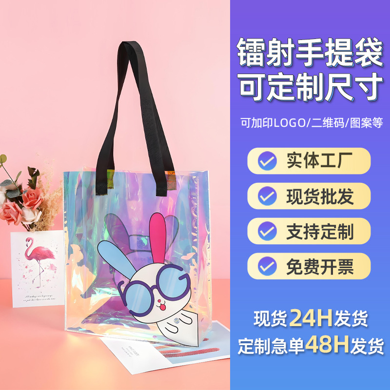 定 制PVC镭射透明手提收纳袋印制logo图案购物礼品果冻幻彩塑料袋