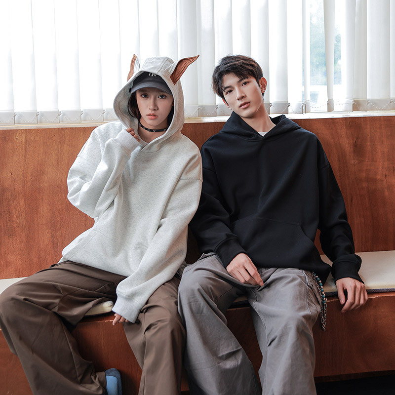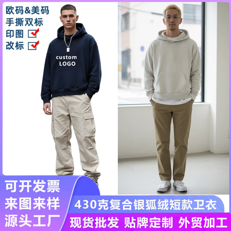 短款复合银狐绒连帽卫衣保暖套头连帽衫cleanfit男装卫衣定制印图