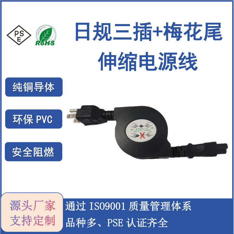 日规三插+梅花尾伸缩电源线日标三芯伸缩延长线PSE认证日本插头