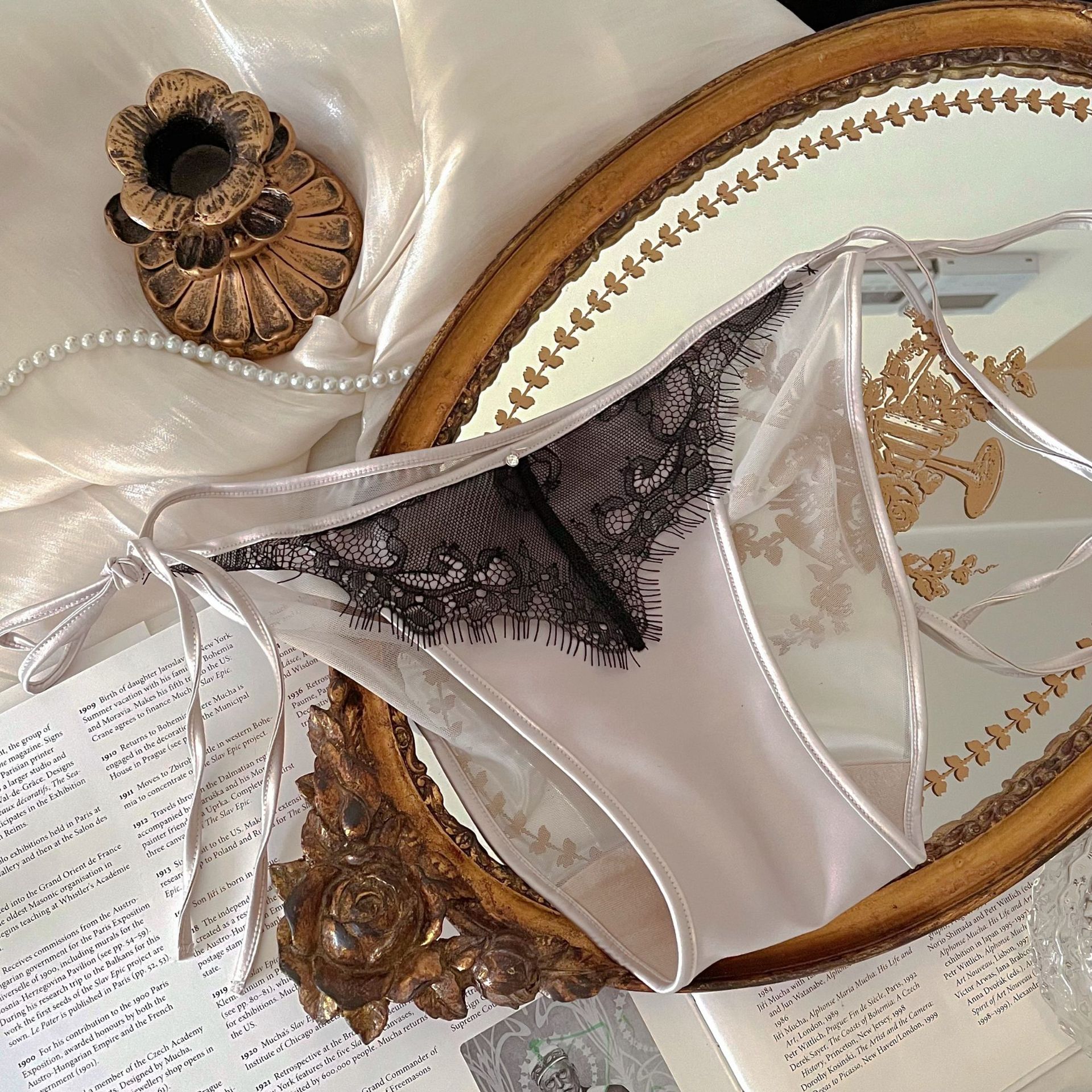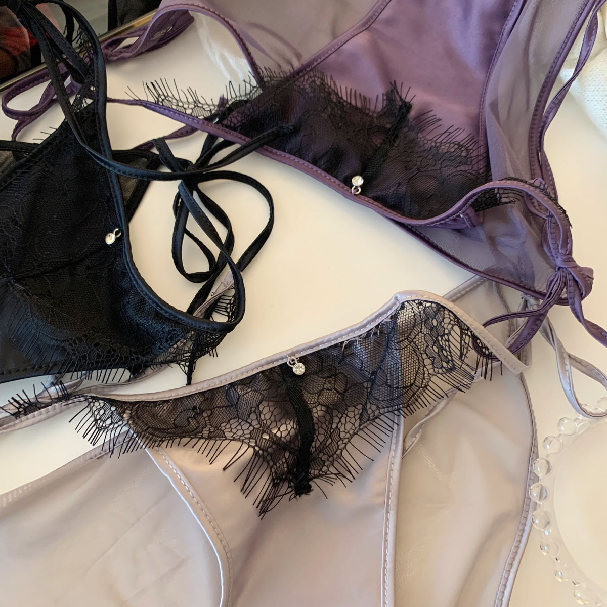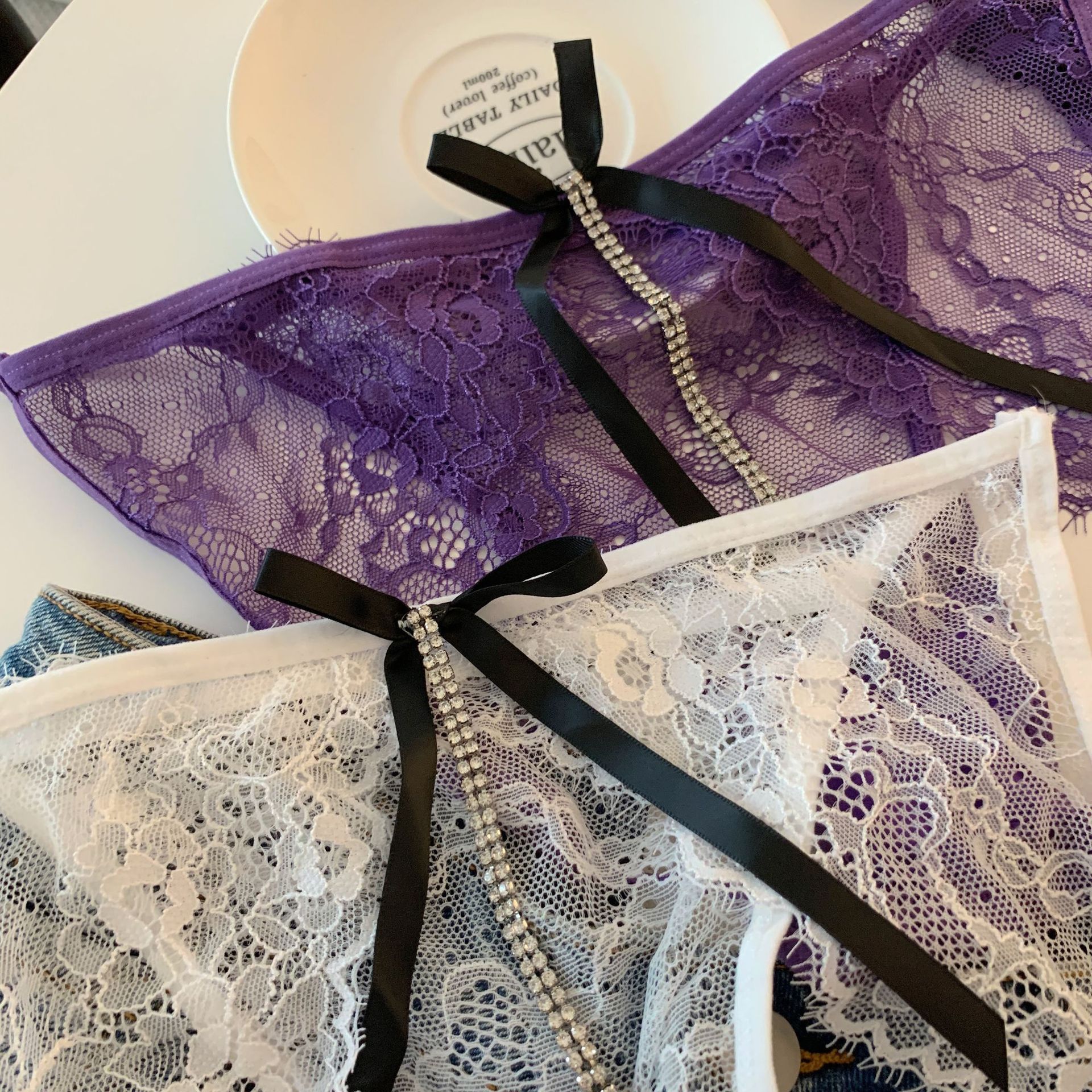 法式高级缎面柔光网纱女生性感蕾丝睫毛透气钻石绑带女士内裤