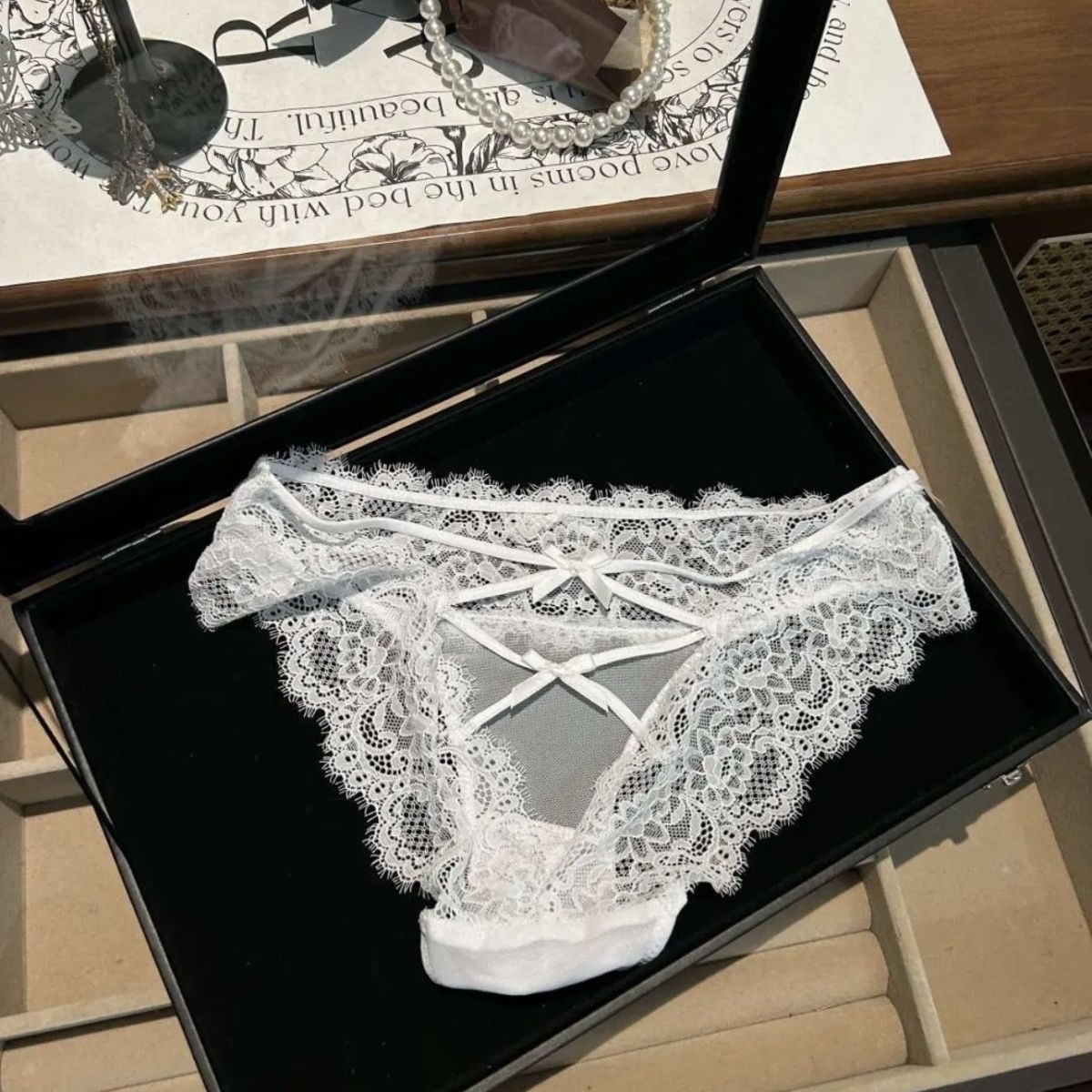 辣辣小腰精*睫毛缎面欧美性感蕾丝内裤蝴蝶结镂空三角裤透明舒适