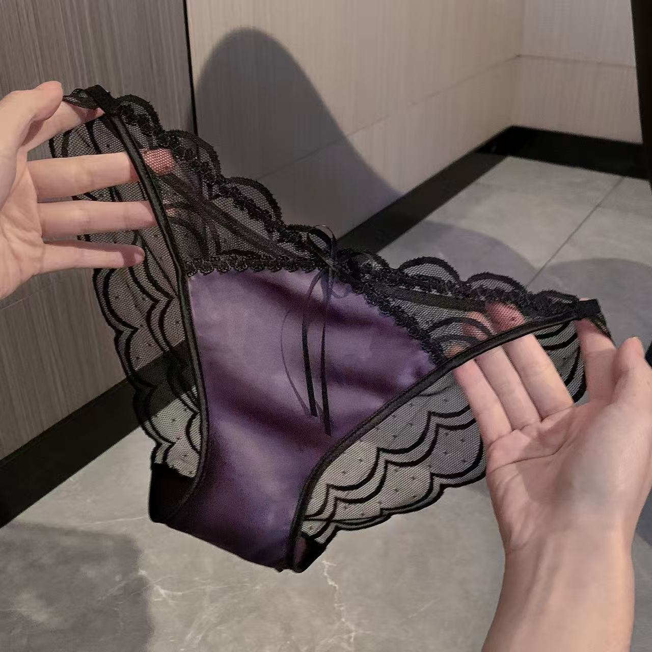暮山紫太美!高级法式绑带可解纯欲蕾丝内裤女缎面紫色性感三角裤