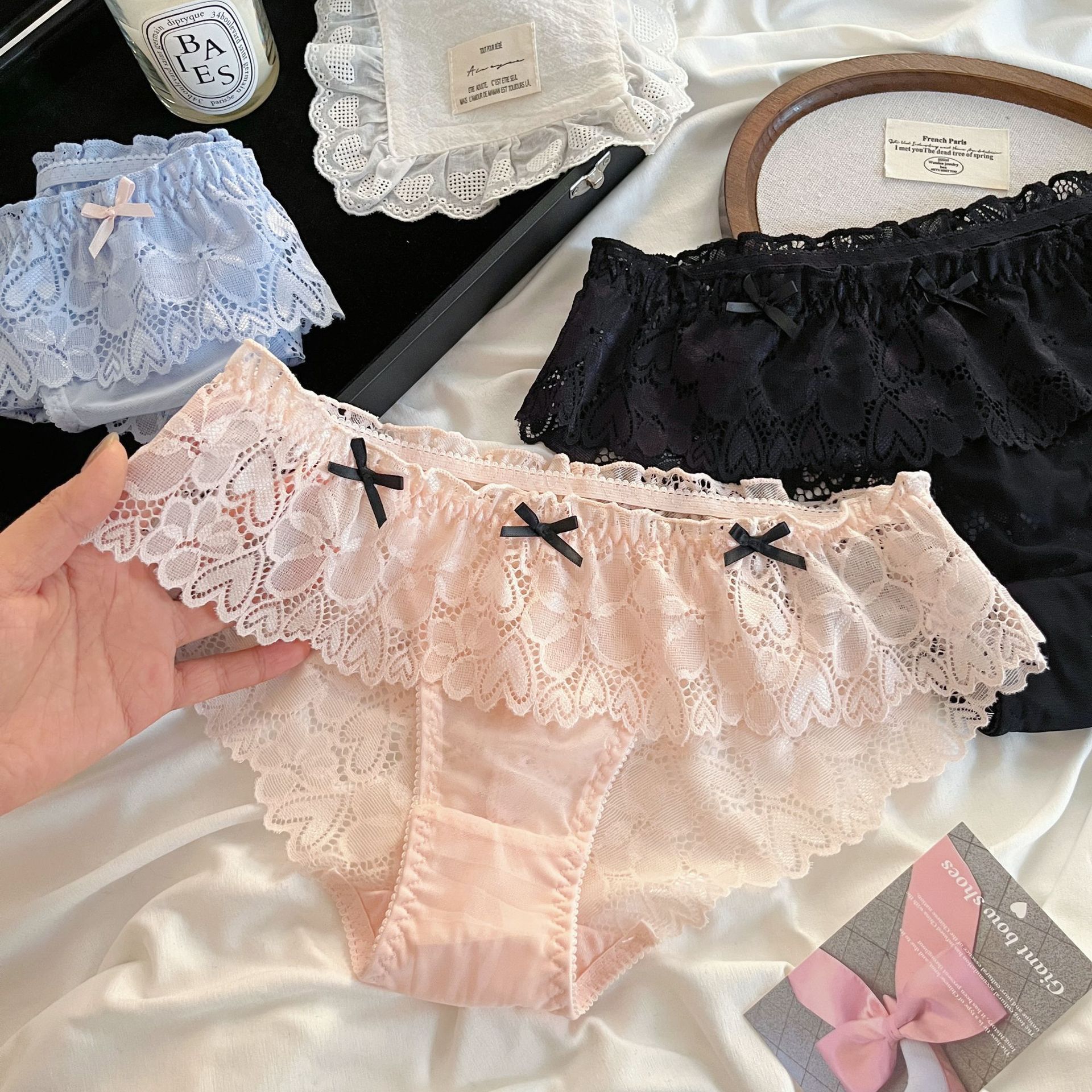 法式纯欲风~贵妇网纱蕾丝半透明低腰性感蝴蝶结纯棉裆女士三角裤