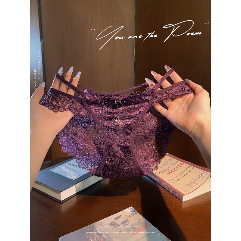 温情布蕾*紫色法式纯欲性感蕾丝边内裤女交叉镂空低腰三角裤情调