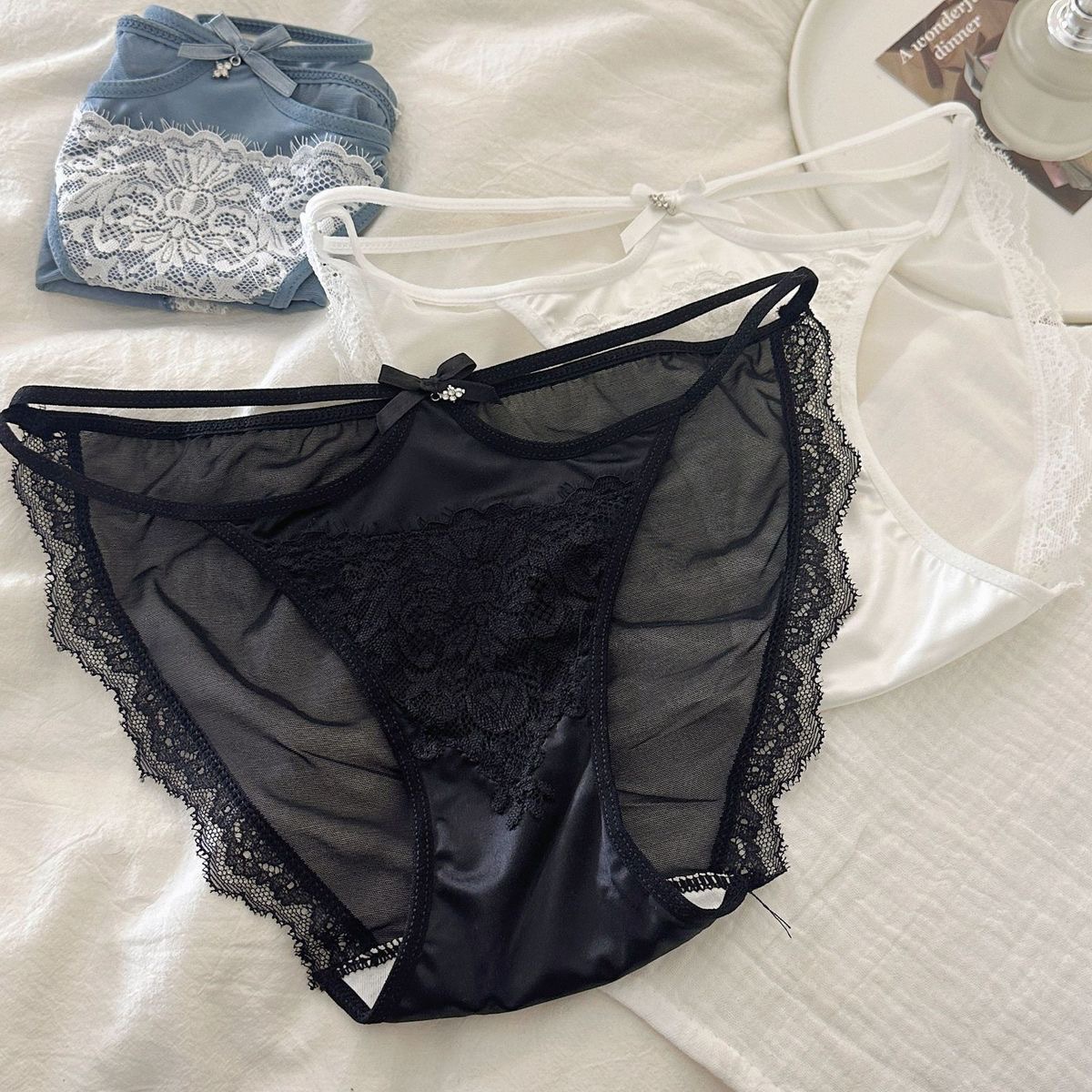 法式纯欲风蕾丝新款镂空细带少女内裤性感高级缎面中腰女士三角裤