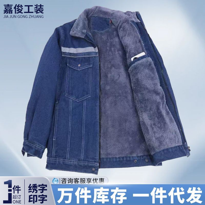 冬季耐磨牛仔套装劳保服工厂车间加厚立领棉服防寒工装户外工作服