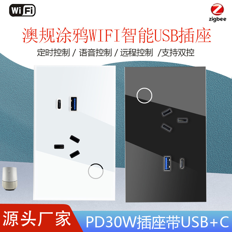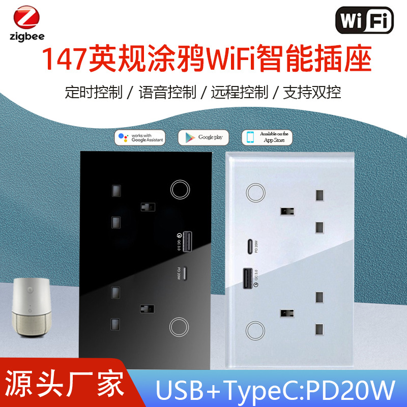147英规涂鸦wifi双插座带计电量功能USB+C钢化玻璃面板智能插座