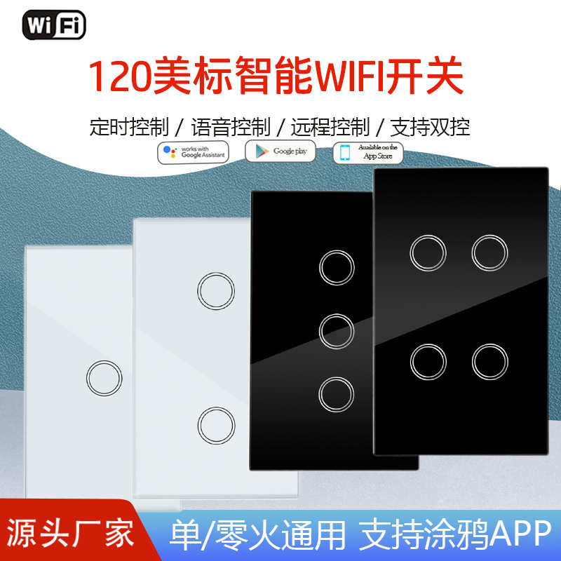 美规涂鸦wifi智能触摸开关零火单零火通用语音远程控制钢化玻璃面