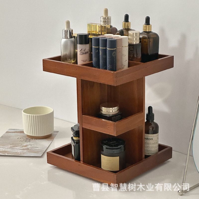 复古旋转置物架实木梳妆台桌面化妆品护肤品口红香水整理收纳盒子