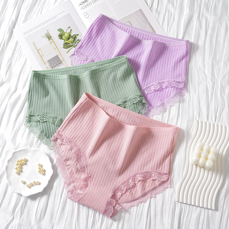 跨境女士纯棉内裤蕾丝边螺纹纯色三角裤大码高腰内裤女厂家批发
