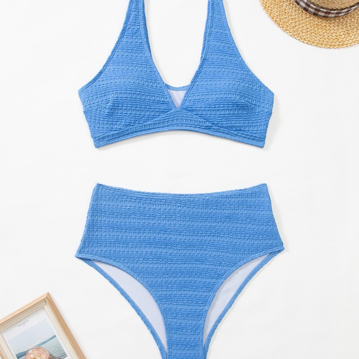 2025外贸分体泳衣女性感撞色欧美亚马逊比基尼挂脖绑带泳装女防晒