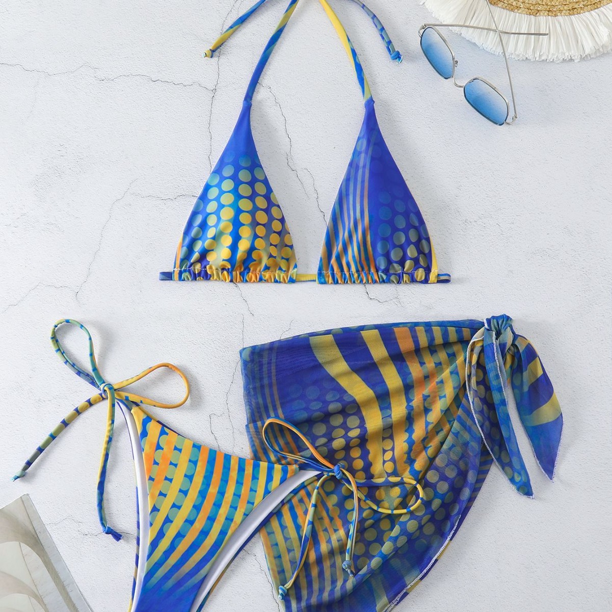 欧美外贸泳衣女分体三件套裙式扎染印花聚拢性感三点式比基尼罩衫