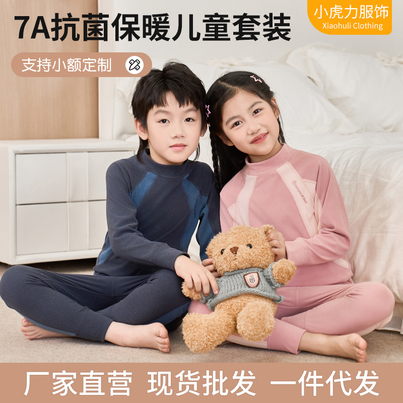 7A双面磨毛保暖儿童套装保暖内衣拼接蓝色粉色套装中大童秋冬款