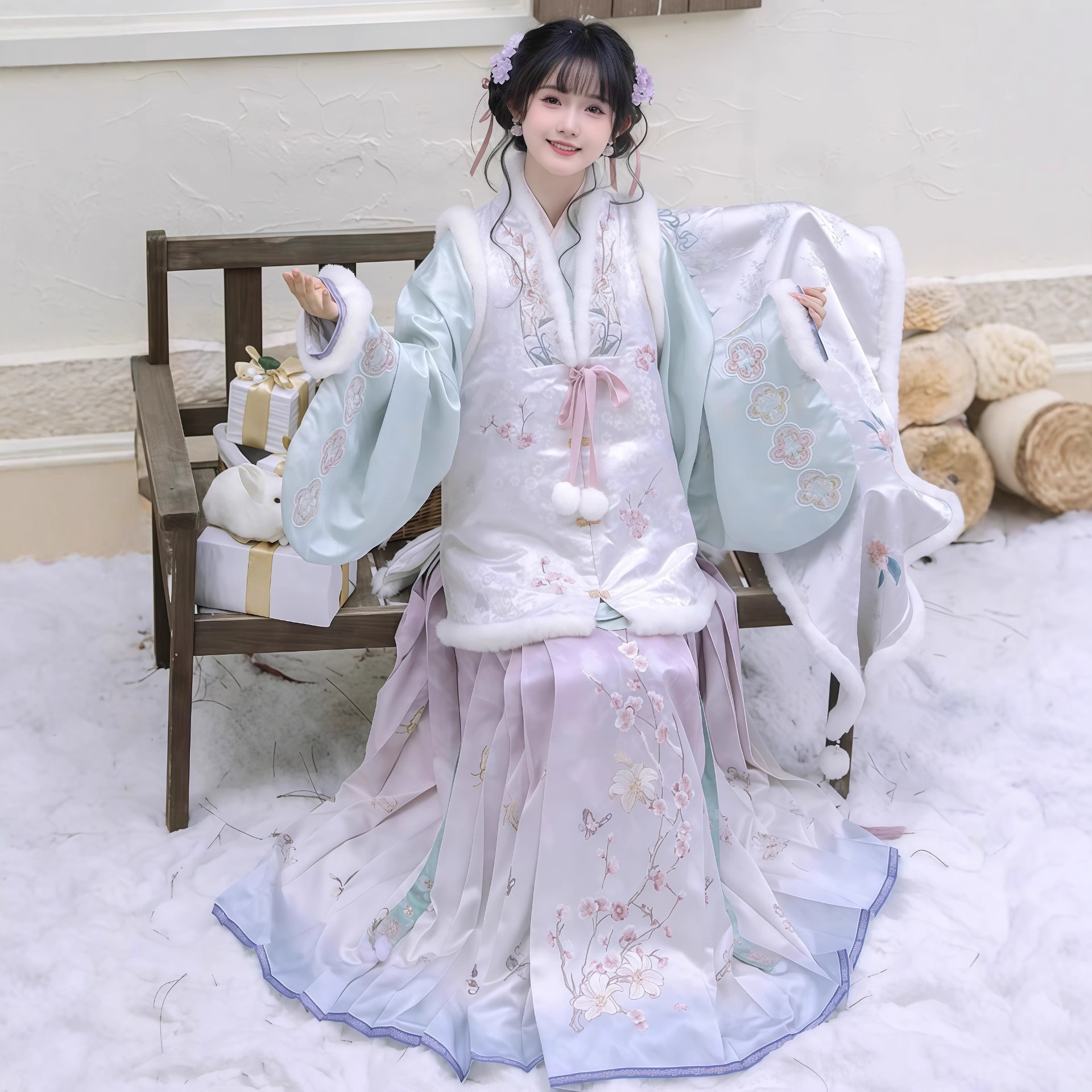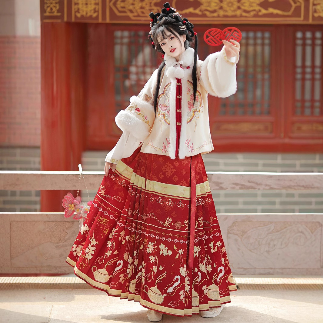 原创成人冬季女款加绒加厚刺绣方领短袄琵琶袖马面裙汉服日常套装