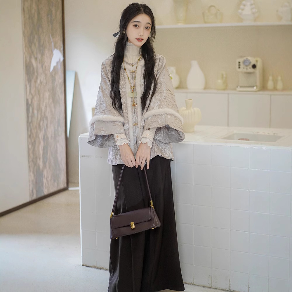 汉服女2025秋冬新款汉洋折衷国风马面裙套装重工刺绣比甲加绒披肩
