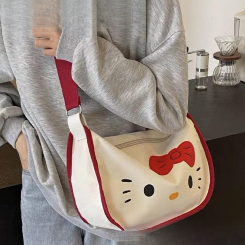 日系卡通帆布包女新款小众设计可爱上课百搭单肩马鞍包斜挎饺子包
