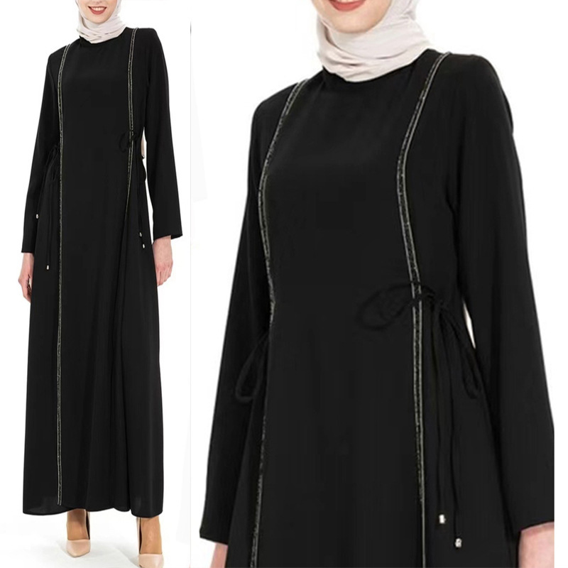 亚马逊独立站中东外贸简约女装长裙圆领宽松A字裙长袖花边连衣裙