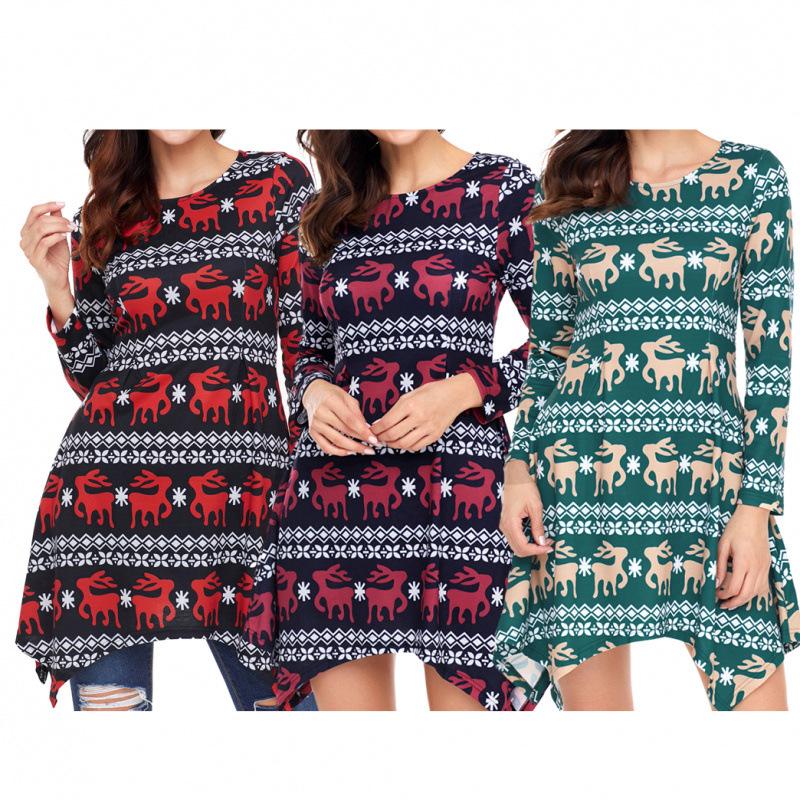 亚马逊独立站跨境外贸女装圣诞小鹿圆领长袖套头不规则下摆连衣裙