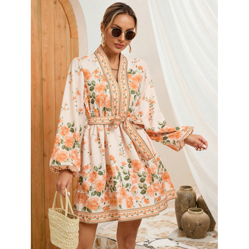 亚马逊独立站跨境外贸欧美花卉印花长袖系带收腰泡泡长袖连衣裙