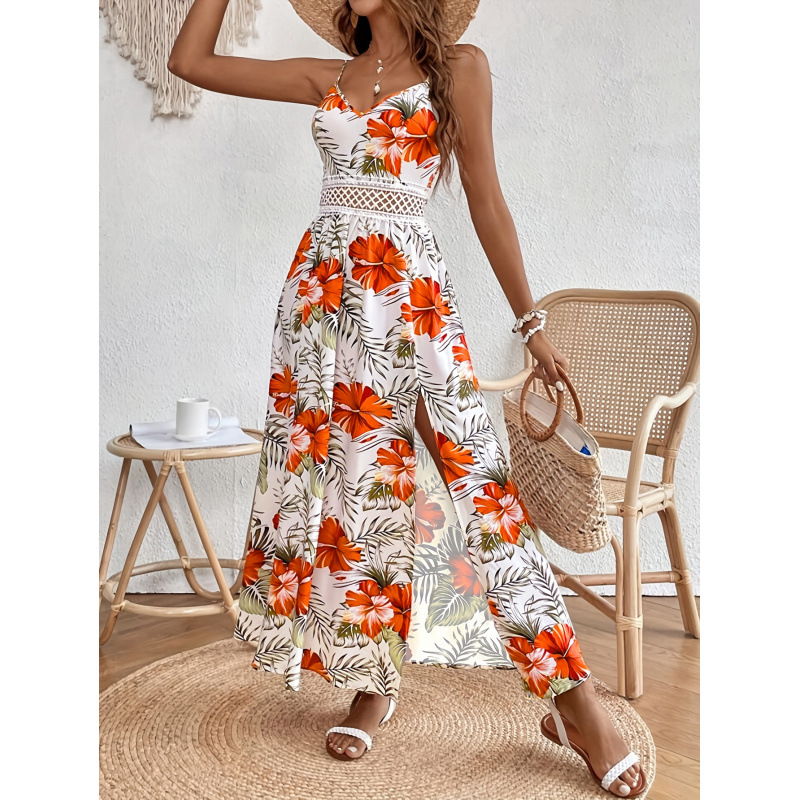 亚马逊速卖通跨境外贸女装 V领吊带印花镂空无袖开叉度假风长裙