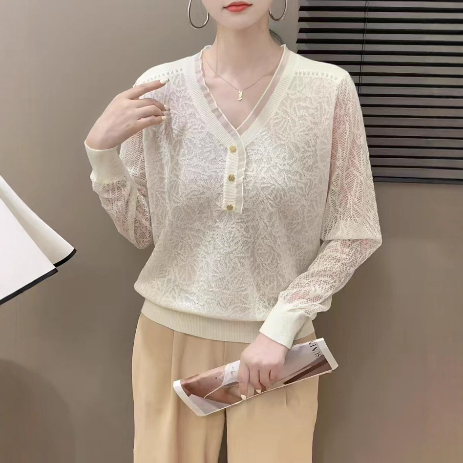 春秋季法式钩花镂空V领钉珠设计欧根纱针织女休闲宽松百搭上衣潮
