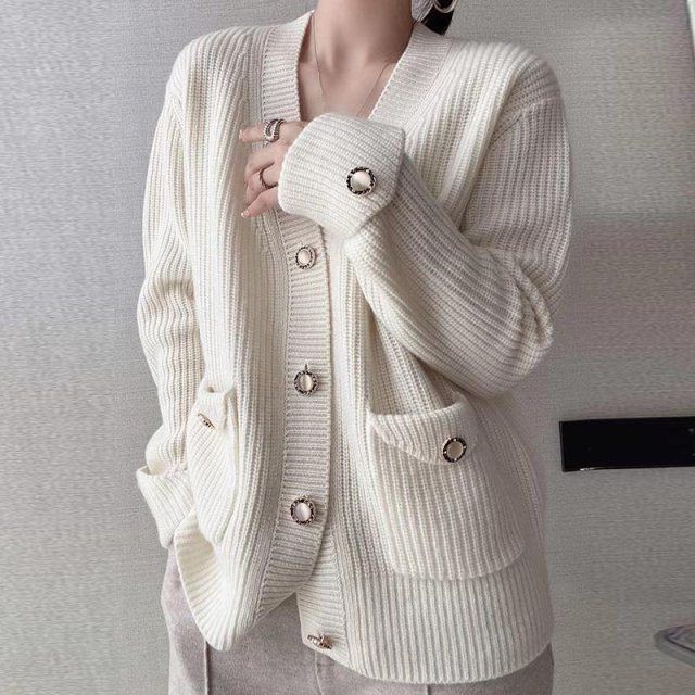 外贸款韩版秋冬季大V领长袖纽扣开衫针织毛衣纯色显瘦减龄百搭潮