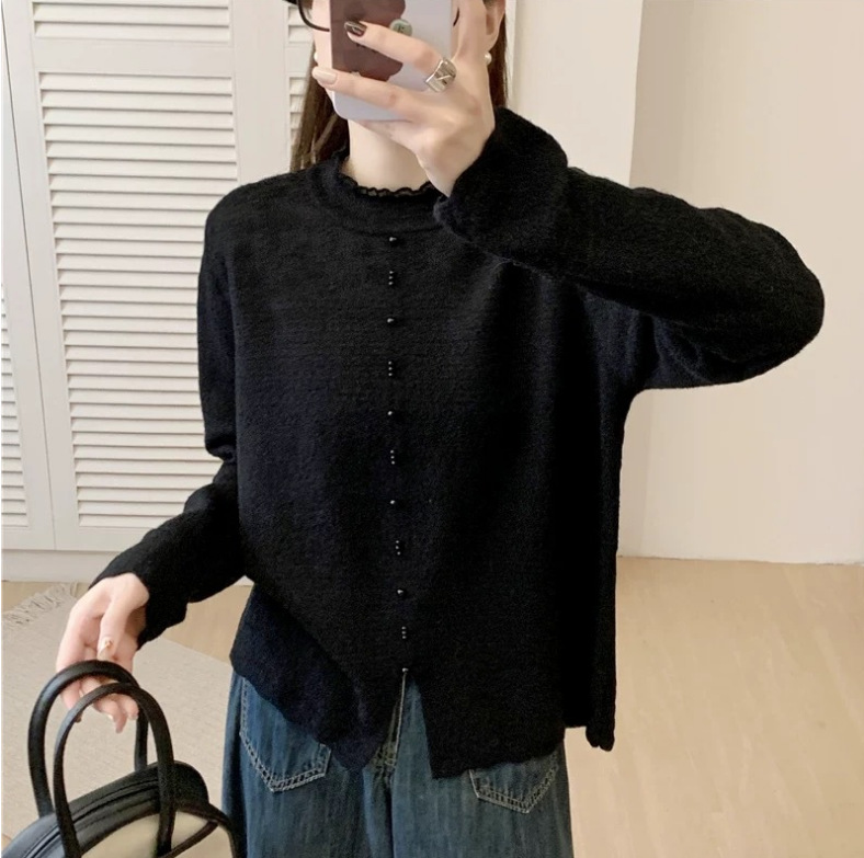 春秋季休闲款女士圆领长袖针织套头纯色钉珠下摆开叉百搭针织外套