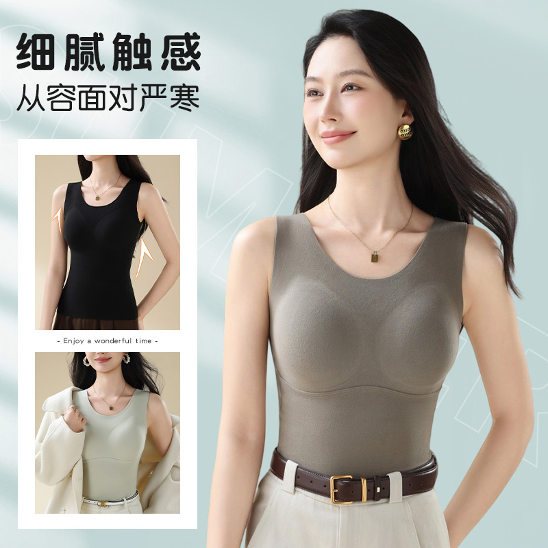 加肥加大固定杯蚕丝背心秋冬无痕保暖内衣女带胸垫内搭女士背心式