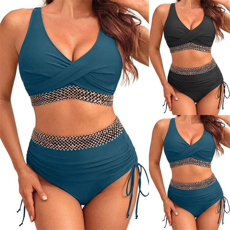 2025欧美外贸bikini双肩交叉蛇皮绑带高腰分体泳衣泳装比基尼