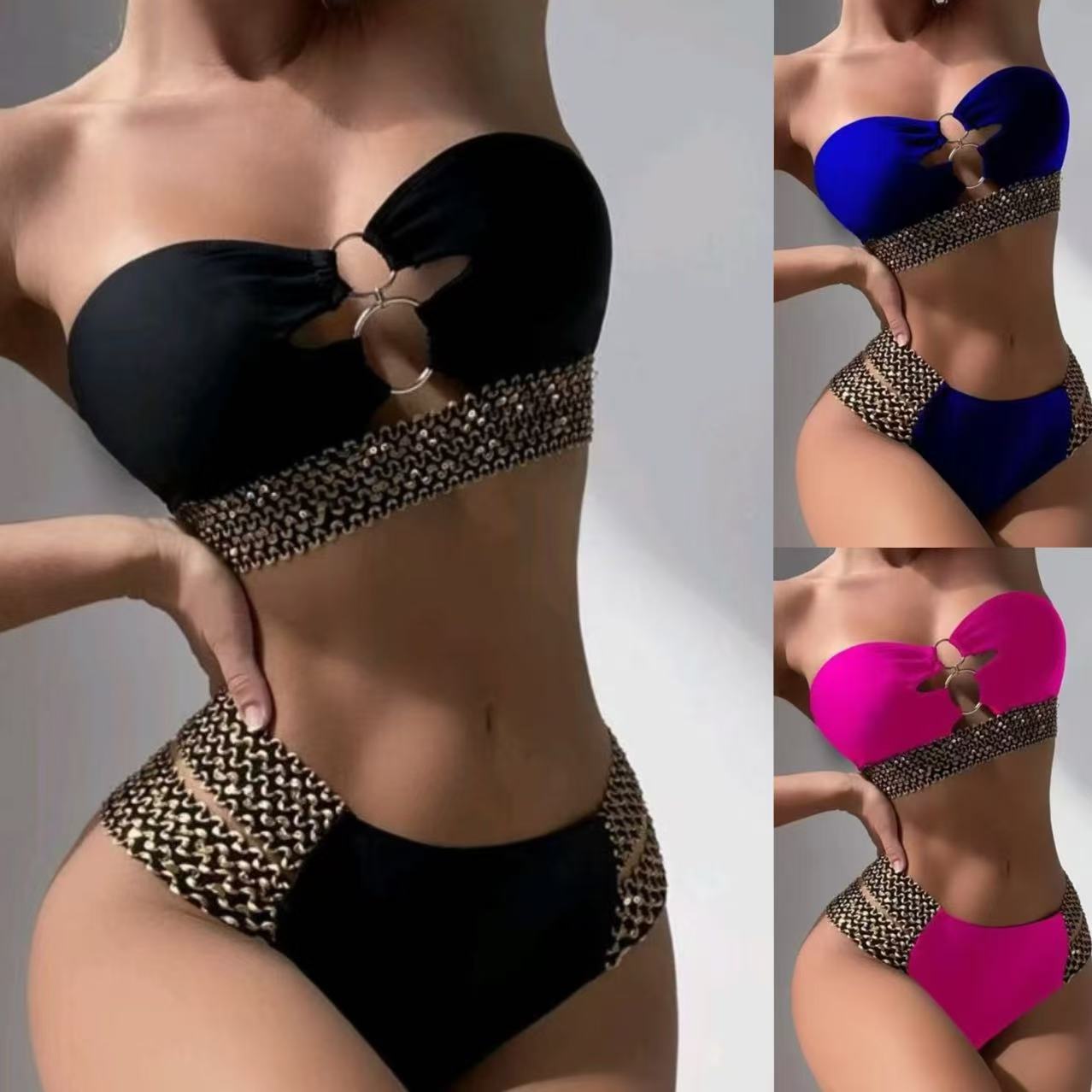 外贸纯色抹胸比基尼2025分体泳衣跨境泳装镂空沙滩bikini无钢托