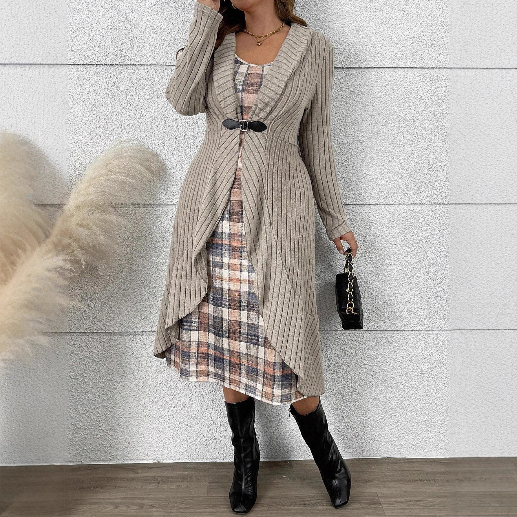 -               2025秋冬跨境褶皱长款长袖开衫风衣外披针织外套内衬连衣裙套装