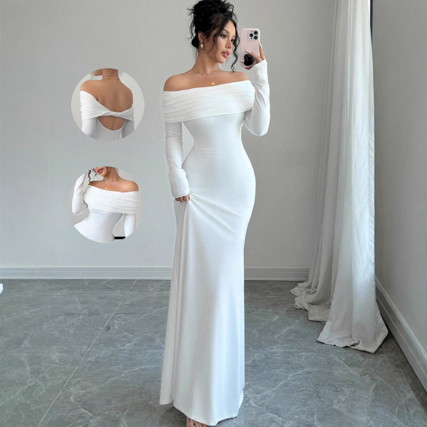 -               外贸2025春季女装一字露肩缩褶紧身时尚优雅包臀长款晚礼服连衣裙