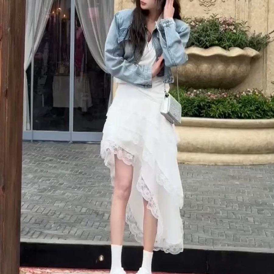 蕾丝拼接不规则半身裙女夏季白色蛋糕裙显瘦高腰中长款A字裙裙子