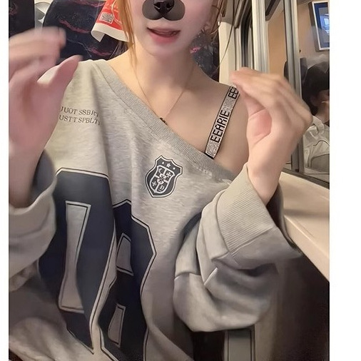 曼巴棉美式数字印花斜肩卫衣女早秋新款辣妹显瘦挂脖露肩上衣灰色