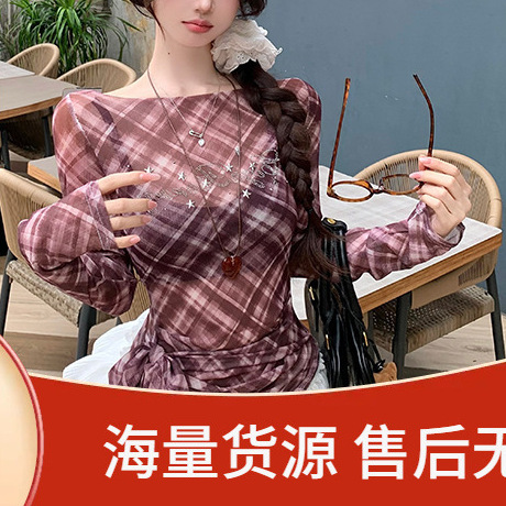 欧来依格子网纱不规则长袖T恤女装2025春夏季辣妹洋气设计感小众
