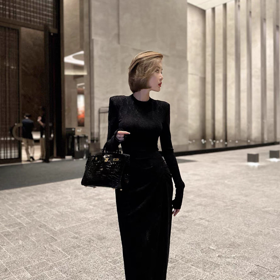 奢感光泽银葱羊毛派对礼服褶皱收腰摩登新贵连衣裙女装开叉连衣裙