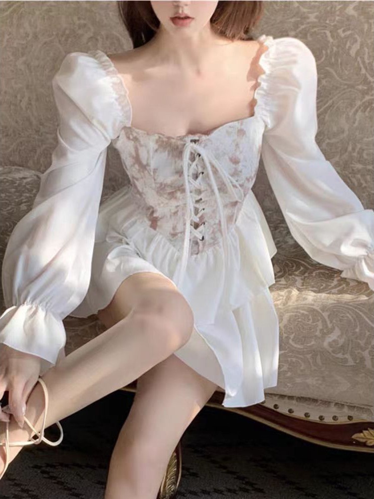 减龄公主裙绑带收腰显瘦设计感撞色泡泡袖甜美蕾丝花边方领连衣裙