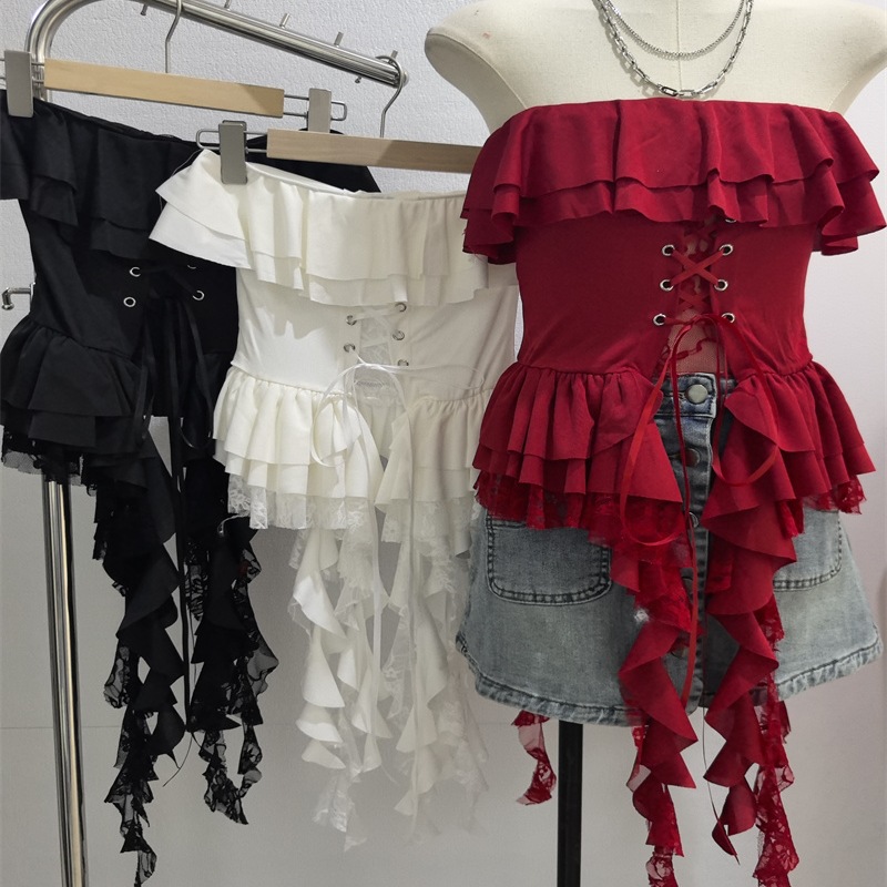 2024甜酷辣妹ins蕾丝拼接抽绳绑带不规则飘带抹胸女性感修身上衣
