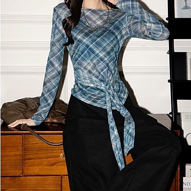 实拍 格子网纱不规则系带长袖T恤女春季辣妹修身设计感上衣蓝色