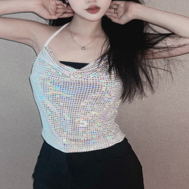ins超火挂脖露肩闪片吊带小背心女夏装无袖短款辣妹内搭潮热