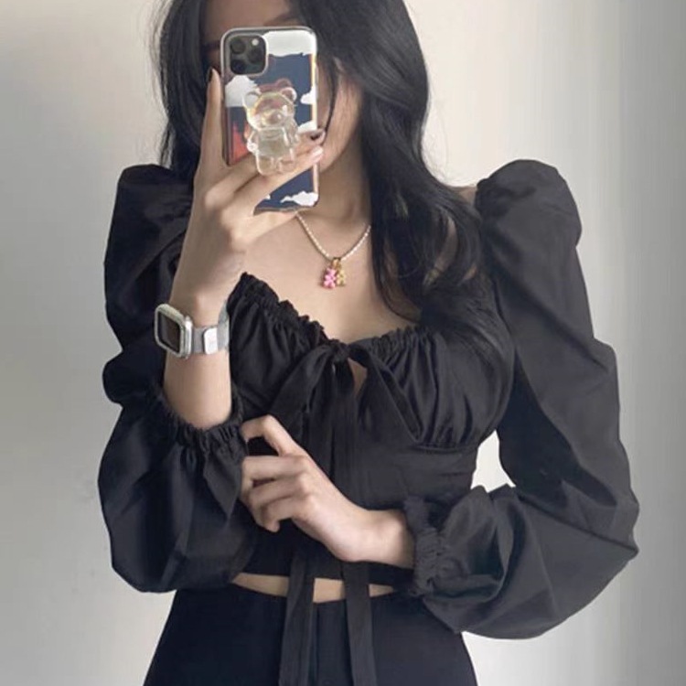 法式设计小众感方领泡泡袖衬衣女春秋季别致短款纯欲上衣黑色